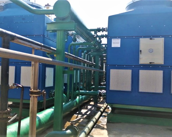 All four cooling towers have access doors made of polypropylene (big enough to facilitate the handling of fills and other maintenance tasks), walkway and vertical ladder to the cooling towers fan motor,